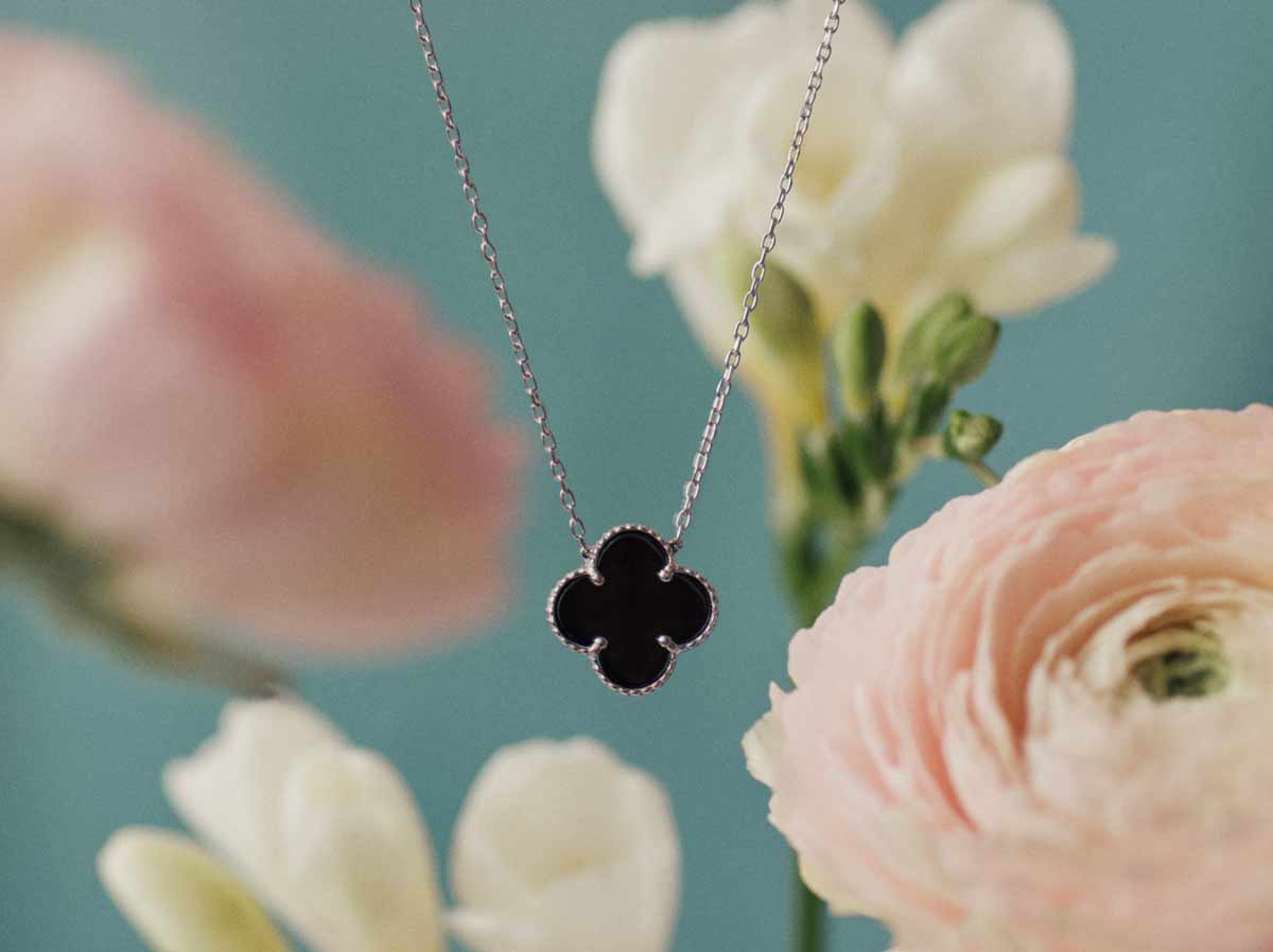 Naszyjnik srebrny z czarnymi koniczynkami