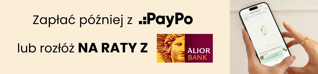 Oferujemy opcję zakupu biżuterii na raty 0%, umożliwiającą opłacenie zakupionej biżuterii w 10 ratach 0%, oraz raty 1% na miesiąc, czyli możliwość opłacenia zakupionej biżuterii w 10 lub 20 ratach z oprocentowaniem 1% miesięcznie od całkowitej kwoty zakupionej biżuterii. RRSO wynosi 24%. Oferujemy również możliwość zakupu biżuterii z wykorzystaniem PayPo – jest to wygodny system płatności odroczonych, umożliwiający opłacenie zakupów w ciągu 30 dni od daty zakupu.